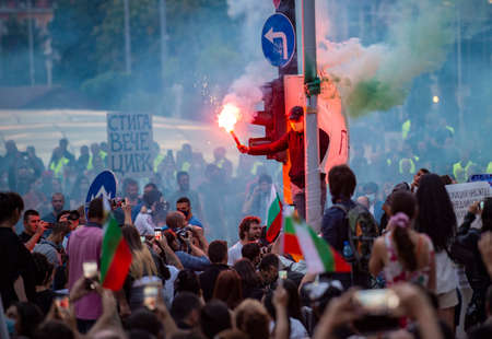 Sofia, Bulgaria - Jul 14 2020: A demonstrator with a smoke stick and mask participating in anti-government protests in the capital