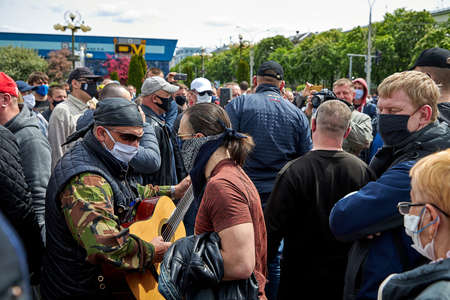 June 14 2020 Minsk Belarus A young woman plays a guitar and sings a song during a protest against the current government