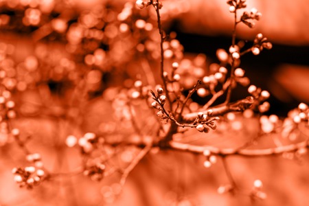 Blossom tree flowers over nature background. Spring flowers. Spring Background with soft focus. toned in coral color. Color of Year 2019. Fashion spring background