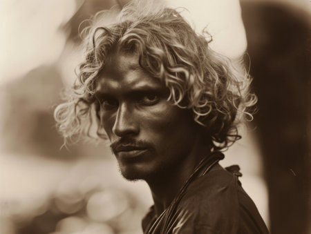 Photorealistic Adult Indian Man with Blond Curly Hair vintage Illustration.