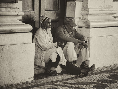 Lisbon, Portugal - 22 august 2018: Street portrait of two beggars sitting on the street asking for change (retro style)