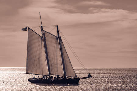 Sailboat under sail on a calm Pacific ocean in evening light with sailors visible o the deck in a side view