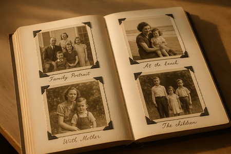 An open, antique photo album showcases four sepia-toned photographs, capturing nostalgic family moments from a bygone era. The images include a large family portrait, a mother with her child at the beach, a mother with her son, and a group of children, each with handwritten captions. The yellowed pages and classic photo corners enhance the historical and sentimental appeal of this timeless collection of cherished memories.