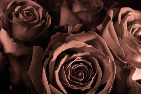 A vintage sepia-toned showcasing a romantic bouquet of roses, a mix of light and darker shades, tied with a delicate lace ribbon. The bouquet rests on an old letter, suggesting a story or a cherished memory. The soft lighting and muted brown tones create an atmosphere of nostalgia and timeless elegance. is conveying themes of love, romance, memory, and classic beauty, with a focus on the delicate details of the flowers and the vintage aesthetic.
