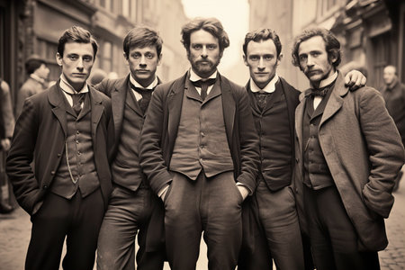 Rich English men walking on street, 1850th, vintage photo of business people 19th century