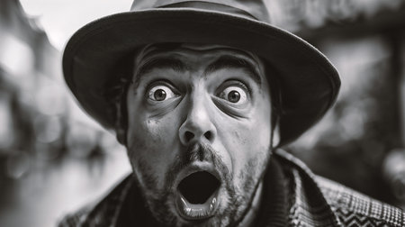 Portrait of a man in a hat with a surprised face.