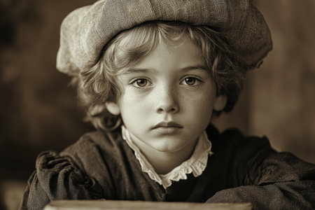 A young boy with curly blonde hair sits quietly, wearing a vintage outfit complete with a soft hat. He gazes thoughtfully, showcasing a contemplative expression in a warm, rustic indoor space illuminated by soft afternoon light.