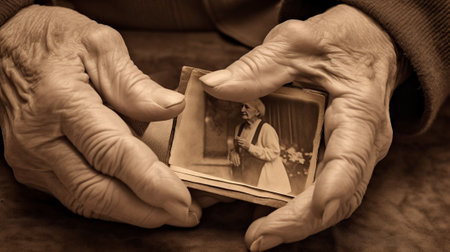 A close-up of elderly hands holding a worn, vintage photograph of a woman, capturing a moment of reflection and connection to the past.