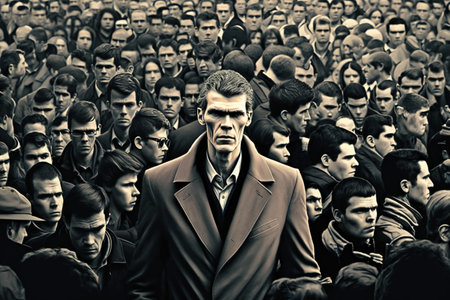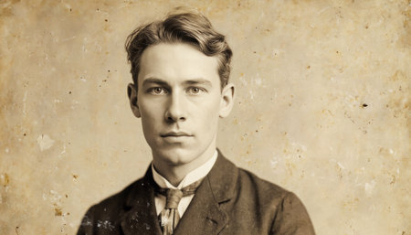 Vintage black and white portrait of a young man in a suit with a concentrated expression on his face. Sepia, aging effect, scuffs. The atmosphere of the past, retro style.