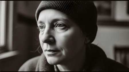 A close-up, black and white portrait captures a middle-aged woman wearing a simple knit hat, looking pensively out a window. The high contrast and film grain effect emphasize her thoughtful expression, wrinkles, and the raw, unpolished nature of the moment.