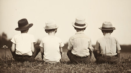 Four boys seated on the grass, backs turned, wearing stylish hats. The atmosphere is joyful, evoking nostalgia and camaraderie, set against a subtle, unbusy background.