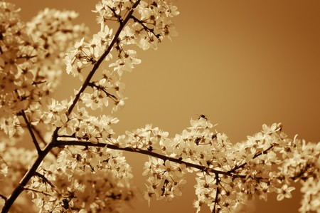 Cherry tree blossom. Narrow depth of field. Sepia tint.