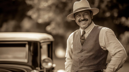 A cheerful man, dressed in a vintage vest and straw hat, stands confidently next to a classic car in sunlight, conveying a sense of nostalgia and style.