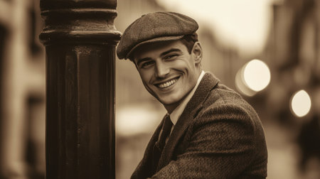 A young man dressed in a classic vintage outfit leans against a lamppost, smiling warmly as the sun sets, casting a soft glow on the bustling street.