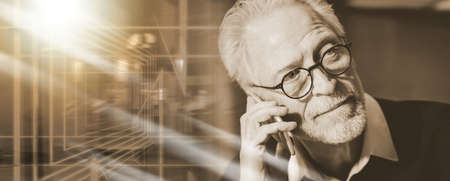 Portrait of senior modern man talking on mobile phone at home; multiple exposure