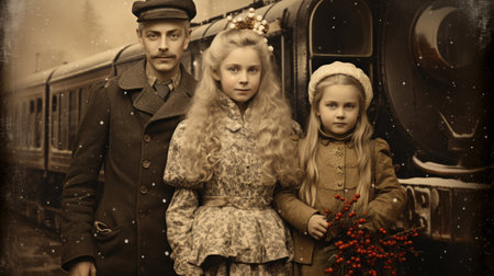 Portrait of a beautiful family on the background of an old train