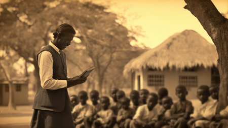 White Caucasian man teaching African children outdoors.The concept of education in Africa, learning problems, third world countries, volunteering, helping a school near a village, lack of knowledge and teachers, outdoor education.