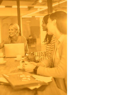 Composition of businesswomen in meeting with copy space on white background. writing background business and colour concept digitally generated image.