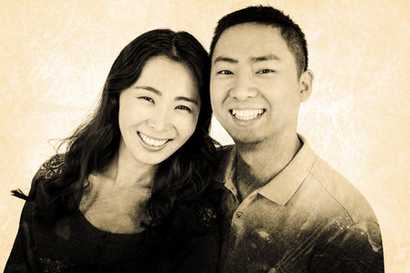 Portrait of couple smiling against grey background