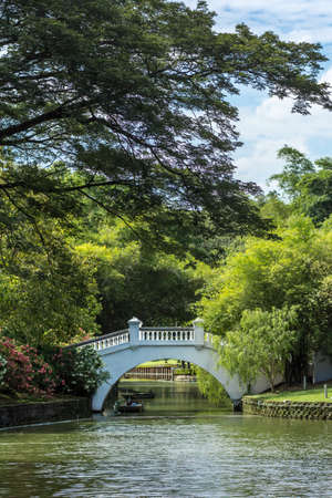 Chinese asian style concrete white footbridge over river in public oriental gardens on sunny day.