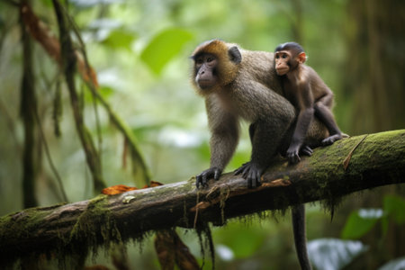 monkey mother, carrying her infant on a journey through the jungle, created with generative ai
