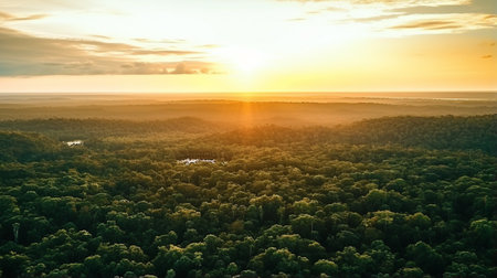 Lush tropical rainforest canopy at sunrise with mist and dense foliage