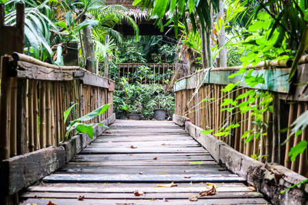 Old wooden suspension bridge used to cross the stream. The trees and plants are full