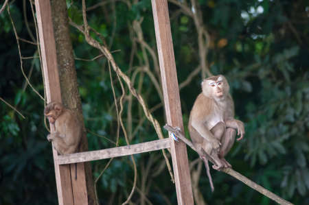 long-tail mountain monkey family sitting on wooden platform. macaca monkey in Thailand