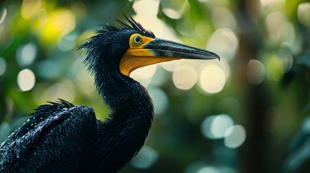 Black bird with a yellow beak stands in a green forest. The bird's head is turned to the side, and it is looking at the camera. The image has a peaceful and serene mood