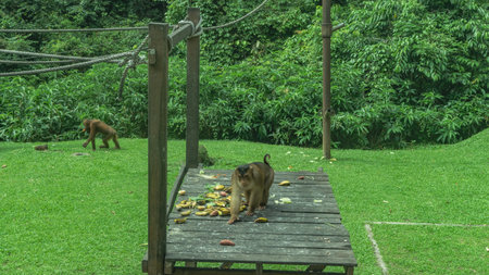 Feeding time at the Sepilok Orangutan Rehabilitation Centre. A stump-tailed Macaca arctoides walks on a wooden deck where fruits are laid out. Another monkey on the green lawn.