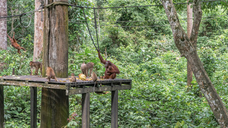 Different monkeys gathered for feeding. Stump-tailed and long-tailed macaques eat fruits laid out on a boardwalk. An orangutan mother hugs a baby. The ropes are stretched. Tropical