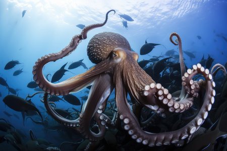 giant octopus kraken swimming through the deep, with schools of fish in its wake, created with generative ai