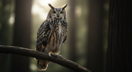 An owl is showcased perched on a branch, set against the backdrop of a blurred forest. The image presents warm and cool tones, highlighting the owl's detailed plumage. This shot's composition, with soft lighting and focus, lends itself to various editorial and commercial applications.