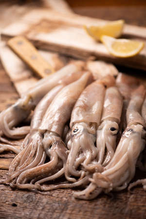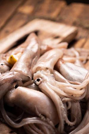 fresh squid on white wooden
