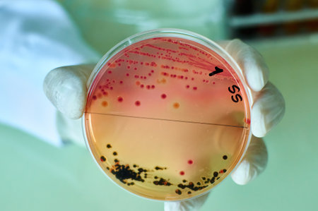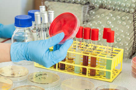 Scientist's hand in latex glove holding the bacteria growing petri dish (Salmonella species on SS agar, selective medium) , medical background