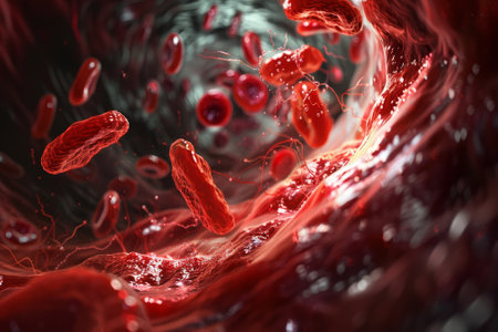 Blood vessel with flowing blood cells, 3D illustration. Small blood vessels, capillaries