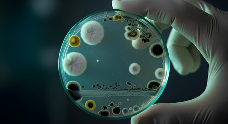 Bacterial and mold fungi colonies grown from hands skin surface on blood sheep agar, photograph showing microbial diversity and skin contamination.