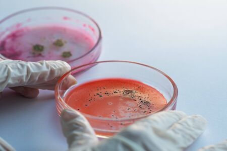 Hand in glove holding Petri plate with bacteria Staphylococcus Aureus, Moraxella Catarrhalis isolated over white background