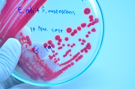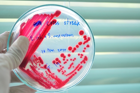 bacterial colonies of E coli on medium plate hold in hand of scientist