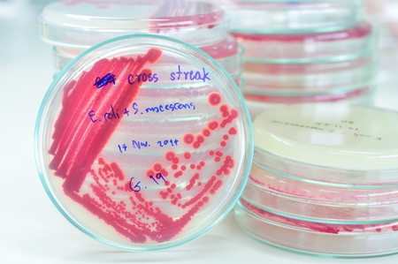 Colonies of bacteria growth on agar plate medium in microbiology laboratory.