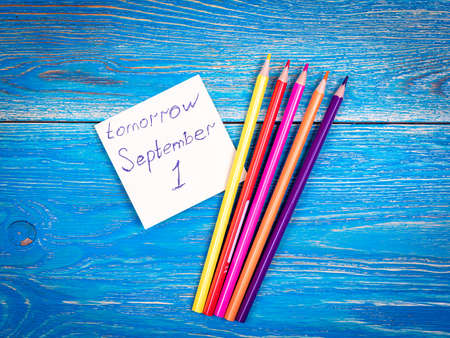 The inscription on the sticker, colored pencils on a wooden table with a vignette. September 1. Design. Background