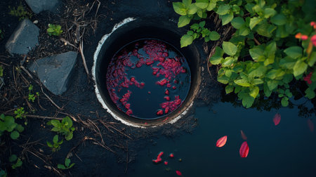 The image captures a pipe discharging muddy water into a natural setting, illustrating the impact of water pollution on the environment with fallen leaves.