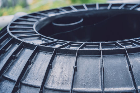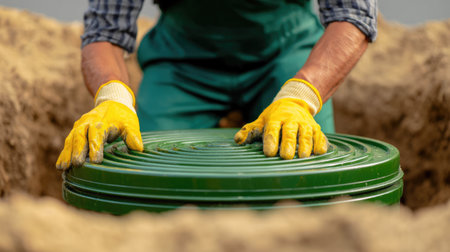 Worker Hands Closing Green Plastic Septic Tank Lid in Ground