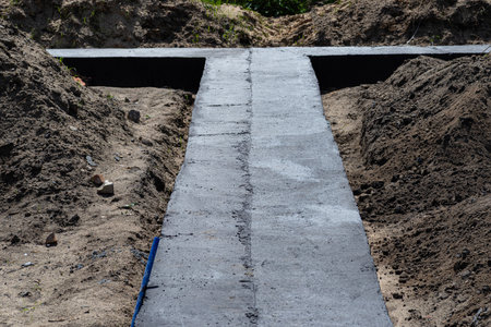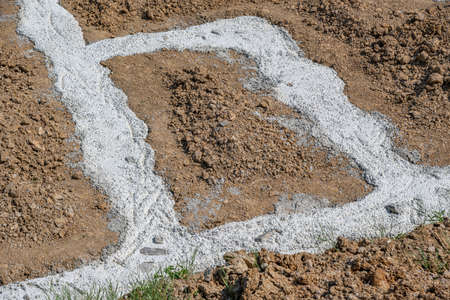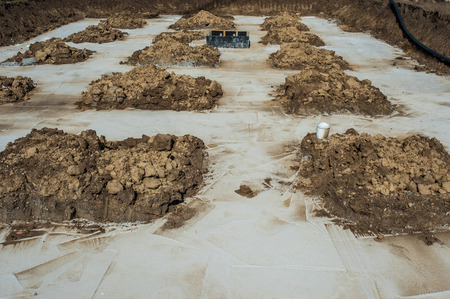 Dug out trench for building works of new house concrete foundation on construction site