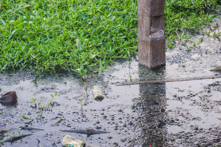 A Contaminated water with debris near storm drain