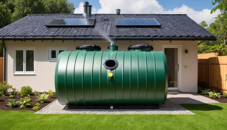 Green garden tank collecting roof water