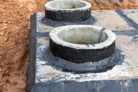 Reinforced concrete rings and slabs for wells on the construction site. Preparation for the device of underground wells and communications. close-up
