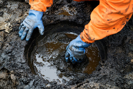 In a well-lit outdoor location, a worker in an orange uniform uses blue gloves to clean a sewer manhole overflowing with dark, thick mud, showcasing dedication to sanitation.
