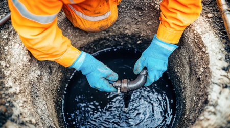 In an open well, a skilled plumber dressed in orange overalls and blue gloves meticulously works on a pipe connecting to a black water source, ensuring cleanliness and efficiency.