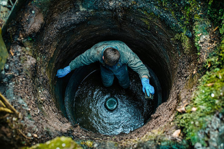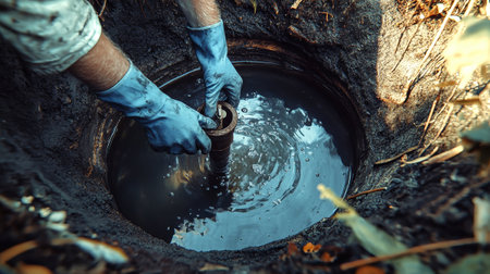 Close-up of a plumber working diligently to clear a pipe leading to black water in a well, showing his skillful hands and focused effort amidst a rustic environment.
